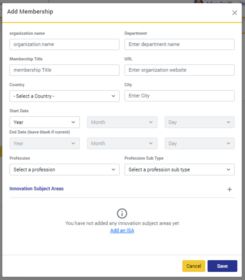 - مجالات الابتكار"Innovation Subject Areas": أضف مجال (مجالات) الابتكار التي تغطيها هذه العضوية.