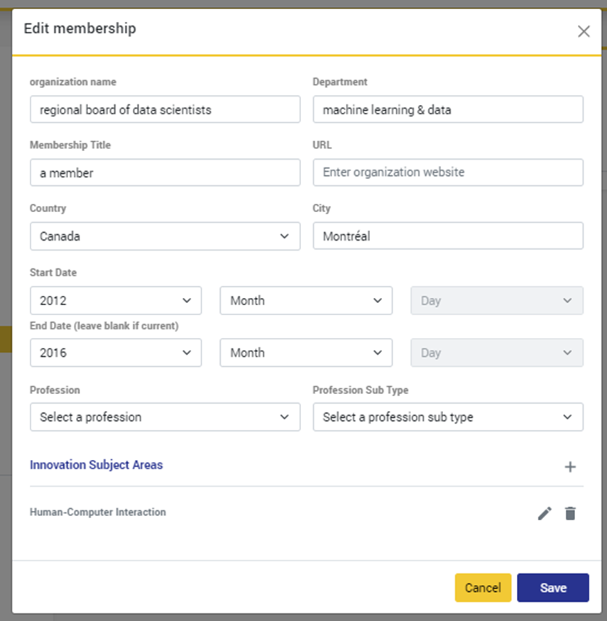 - تاريخ الانتهاء"End Date" : تاريخ انتهاء علاقتك بالمؤسسة ، على سبيل المثال ، عندما قمت بالانسحاب من هيئة أومجلس. إذا كنت لا تزال مشتركًا في المنظمة ، فلن تحتاج إلى تقديم تاريخ انتهاء.