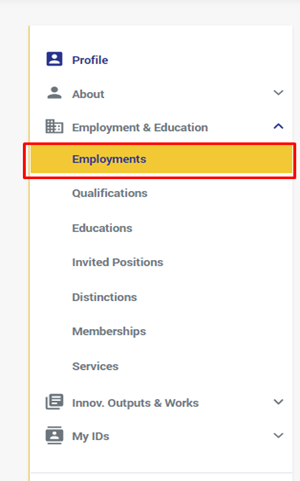 3. You will be redirected to the "Employments" page to add your employment affiliations by: