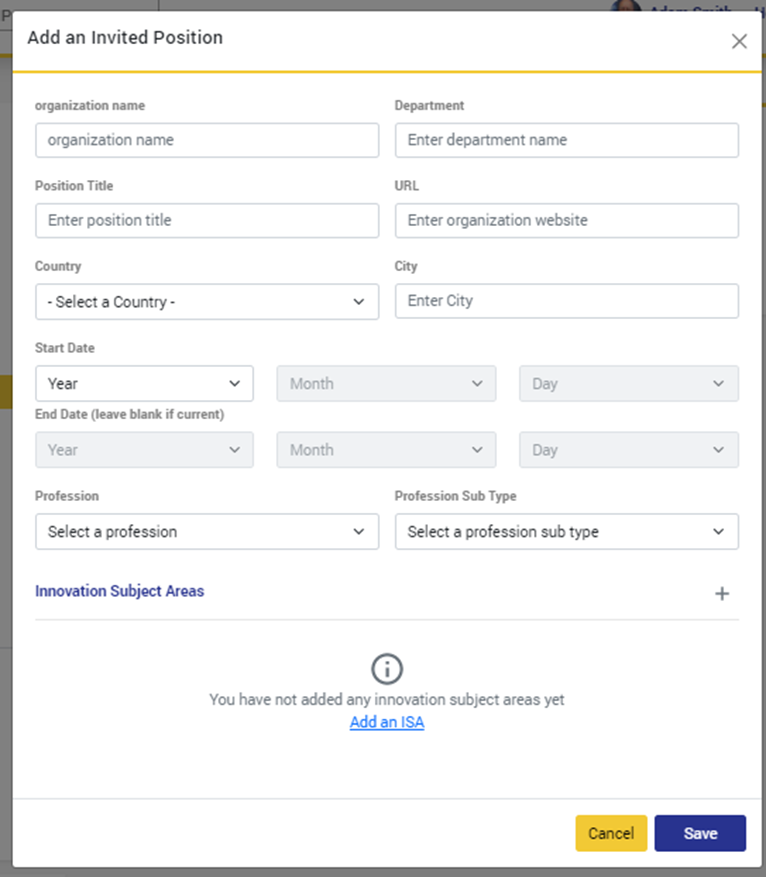 - Innovation Subject Areas: add the Innovation Subject Area(s) this invited position covers